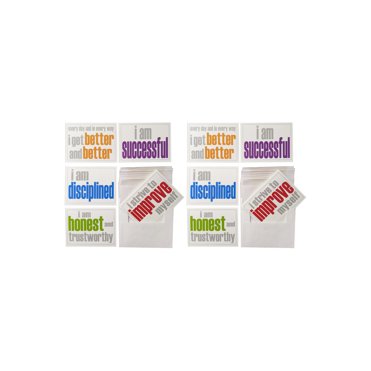 Each Inspired Minds Inner Strength Booster Set consists of 10 Note Cards with Envelopes. There are 5 statements intentionally printed simple, yet colorful, to offer an impactful and creative way to help gain inner strength and build character to last a lifetime. Make someone's day...and your day too, by sending an uplifting personal message inside these 5-1/2" x 4-1/4" blank note cards. Each set includes 10 note cards with envelope, 2 each of the 5 titles that match all Inner Strength Booster Sets. Sold as 2 sets for a total of 20 note cards with envelopes.