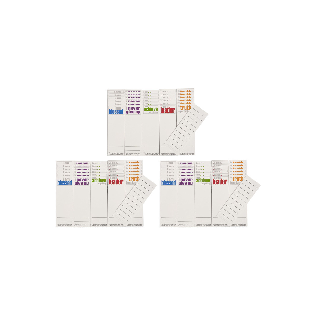 Each Inspired Minds Encouragement Booster Set consists of 30 Page Keepers. There are 5 statements intentionally printed simple, yet colorful, to offer an impactful and creative way to help gain encouragement and build character to last a lifetime. These page keepers not only work as a daily reminder, but can be signed to take ownership of believing in yourself! Because these are uncoated, with the blank space in the front and lines on the reverse side, there are unlimited uses. Draw, color, add pictures, list books, friends, story content or favorite characters, record reading time, and the list goes on! Laminate as a keepsake! Page keepers measure 2" x 6". Each set has 6 each of the 5 titles that match all Encouragement Booster Sets. Sold as 3 sets for a total of 90 page keepers.