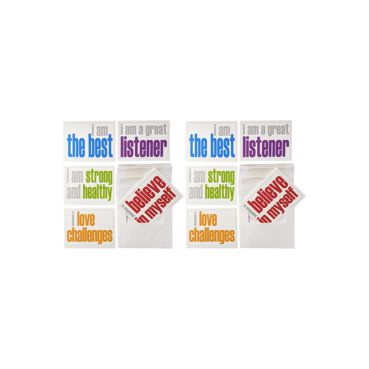 Each Inspired Minds Positivity Booster Set consists of 10 Note Cards with Envelopes. There are 5 statements intentionally printed simple, yet colorful, to offer an impactful and creative way to help gain positivity and build character to last a lifetime. Make someone's day...and your day too, by sending an uplifting personal message inside these 5-1/2" x 4-1/4" blank note cards. Each set includes 10 note cards with envelope, 2 each of the 5 titles that match all Positivity Booster Sets. Sold as 2 sets for a total of 20 note cards with envelopes.