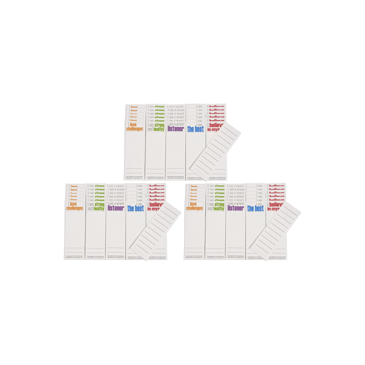 Each Inspired Minds Positivity Booster Set consists of 30 Page Keepers. There are 5 statements intentionally printed simple, yet colorful, to offer an impactful and creative way to help gain positivity and build character to last a lifetime. These page keepers not only work as a daily reminder, but can be signed to take ownership of believing in yourself! Because these are uncoated, with the blank space in the front and lines on the reverse side, there are unlimited uses. Draw, color, add pictures, list books, friends, story content or favorite characters, record reading time, and the list goes on! Laminate as a keepsake! Page keepers measure 2" x 6". Each set has 6 each of the 5 titles that match all Positivity Booster Sets. Sold as 3 sets for a total of 90 page keepers.