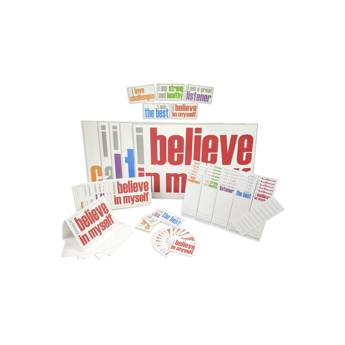 This Inspired Minds Ultra Booster Set consists of 150 items with statements intentionally printed simple, yet colorful, to offer an impactful and creative way to help gain Positivity and build character to last a lifetime. Surround yourself with Inspired Minds affirmation products daily to inspire positive thoughts, actions, and attitudes, which will lead into finding true happiness and ultimate success. Using these powerful products together will immediately enhance efforts on building a healthy mind set. Set consists of 5 – 11" x 17" Posters, 5 – 2" x 3-1/2" Magnets, 100 – 2" x 3" Hand off Notes, 30 – 2" x 6" Double-Sided Page Keepers Bookmarks, 10 – 5-1/2" x 4-1/4" Note Cards with Envelopes.