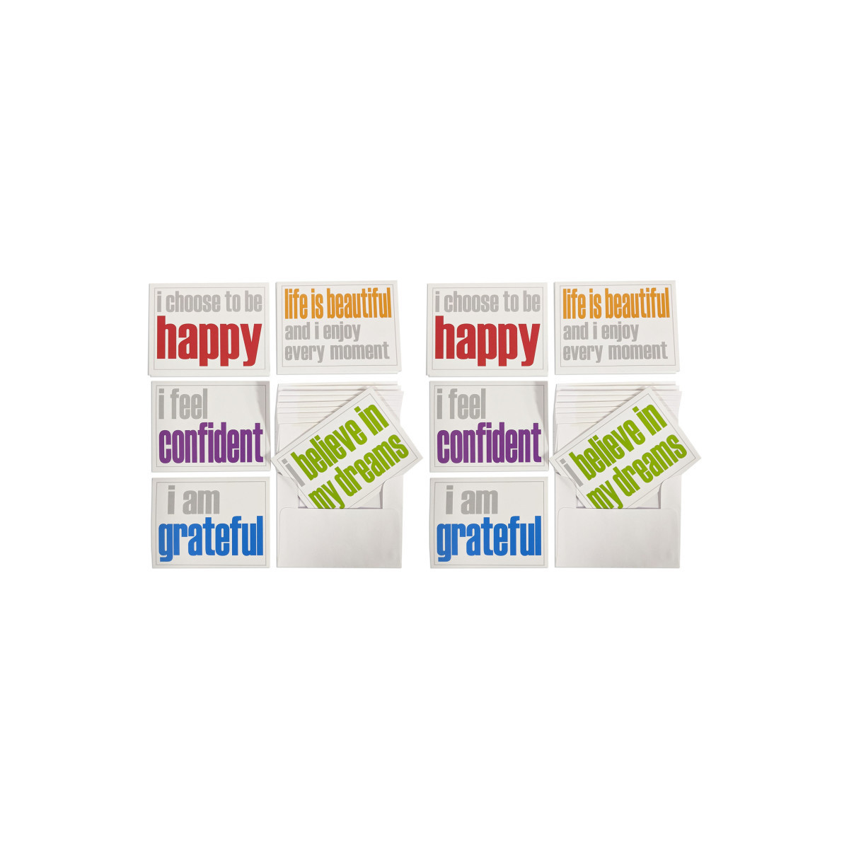 Each Inspired Minds Confidence Booster Set consists of 10 Note Cards with Envelopes. There are 5 statements intentionally printed simple, yet colorful, to offer an impactful and creative way to help gain confidence and build character to last a lifetime. Make someone's day...and your day too, by sending an uplifting personal message inside these 5-1/2" x 4-1/4" blank note cards. Each set includes 10 note cards with envelope, 2 each of the 5 titles that match all Confidence Booster Sets. Sold as 2 sets for a total of 20 note cards with envelopes.