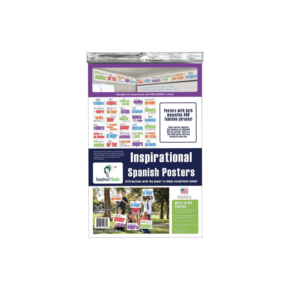 Inspired Minds Spanish Posters are intentional printed simple, yet colorful, to offer an impactful and creative way for teachers to help children gain self-esteem, inner-strength, encouragement, hopefulness, positivity, confidence and build character to last a life time. Surrounding children with affirmations on a daily basis will help develop inner tools to find true happiness and ultimate success.