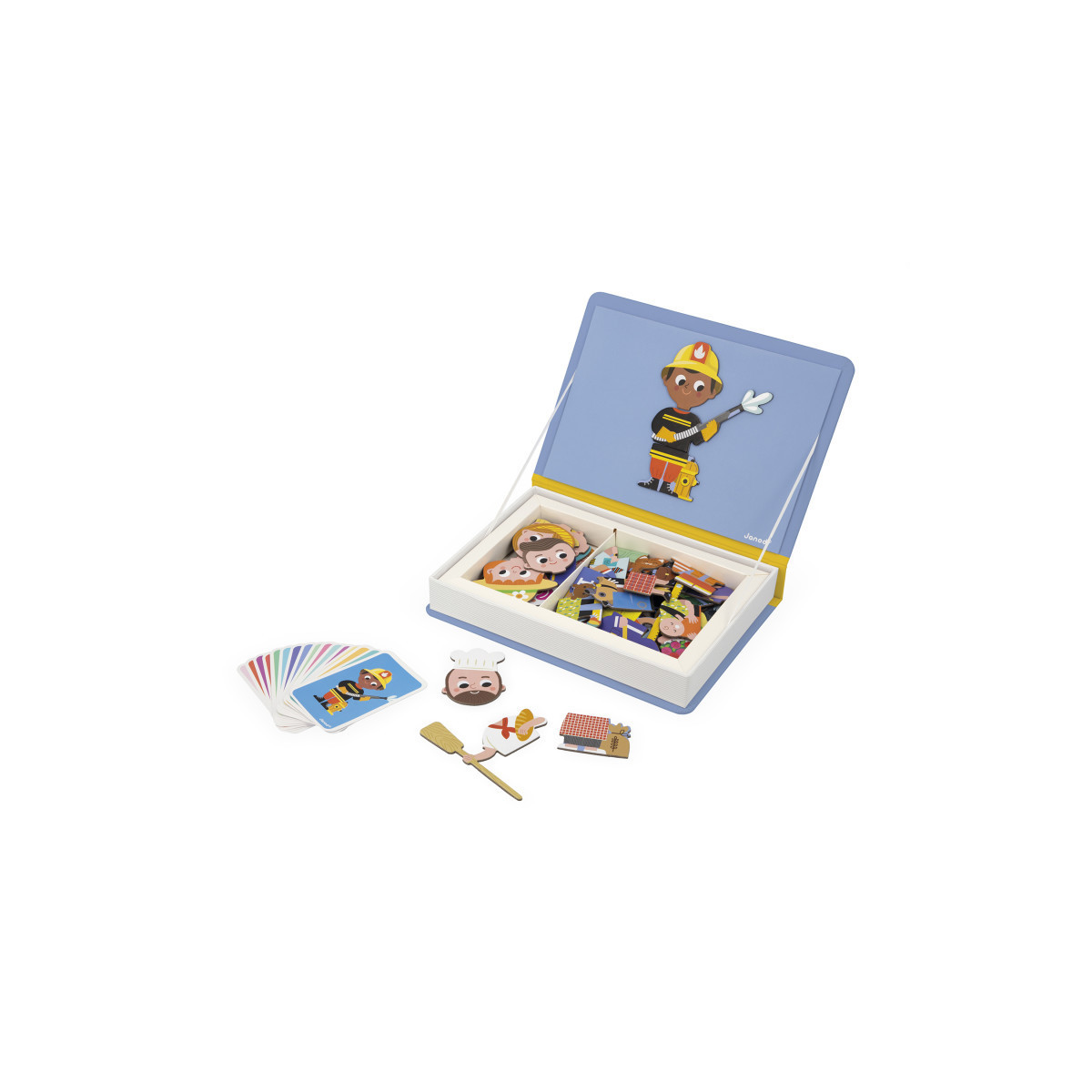 When I grow up, I’m going to be... Open your magneti'book to discover different professions! With this lovely colorful magnetic toy, your child will discover 16 professions, with the possibility of inventing many more! It consists of a magnetic board, 48 magnets and 16 cards representing well-known professions. Young and old alike will have fun reproducing the templates and mixing them up to come up with the most eccentric mix of professions. Magnetic toy made of cardboard for children aged 3 to 8.