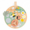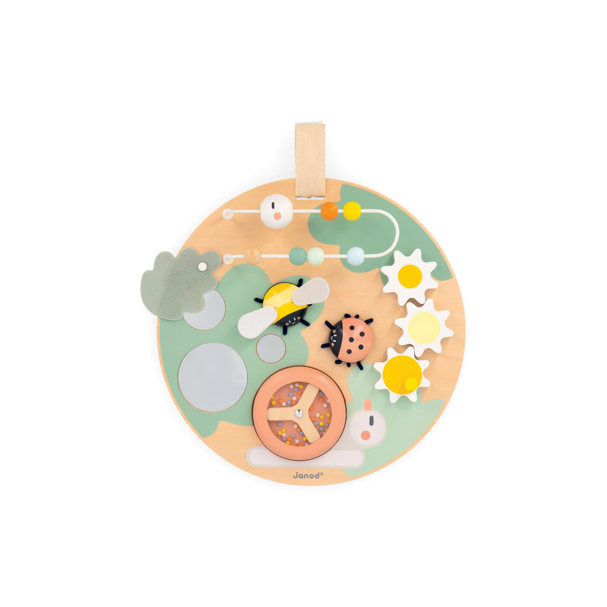 Come and see, the bee is ready to fly away, the ladybird spins around and the caterpillar goes for a walk! This beautiful wooden board includes lots of garden animals with fun features. It has 7 activities: 3 daisy-shaped gears to turn, 1 abacus, 1 ladybird that can be screwed on and off, 1 bee that makes a clicking sound when you turn it, 1 snail whose shell turns to rattle the multi-colored beads inside, and finally, 3 mirrors, 1 of which is hidden under the felt leaf. This board is very practical and adapts to the child's most comfortable play position. Thanks to its movable base, the activity board can be set at a 45 degree angle so that the child can play easily when seated or at a table. Without the base, the board is completely flat and can be hung on the wall or on the bars of the playpen using the large Velcro fastener at the top. It's a simple, comprehensive toy in soft colors that will help your child develop fine motor skills and dexterity. Early learning toy for children from 12 months.