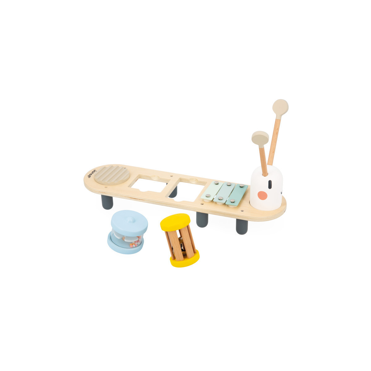 Make some noise for the musical caterpillar! Discover our caterpillar-shaped sound activity table. This early-years toy has been designed for babies aged 12 months and up. This colorful caterpillar is not only adorable, but also a one-man band! With its 5 built-in sound activities, your child can explore and create their own symphony. There's a maracas to add rhythm, a xylophone to play melodies, a bell for a sweet sound, a rain stick to imitate the soothing sound of rain, and a scratcher for a unique sound texture. Practical and well thought-out: the sticks are stored in the caterpillar’s head to ensure that they don’t get lost. Furthermore, the 2 rattles and head of the caterpillar are removable for even more play options: baby can grab whichever musical toy they choose, then learn to return it to the right place on their early-learning stand. This early-years toy is not only fun, but also educational and beneficial when it comes to your baby's development. It helps develop their hearing acuity, so they can begin distinguishing between and understanding different sounds. Furthermore, they’ll develop their motor skills by manipulating and shaking the small instruments. Imagine your child headlining their own concert with their musical caterpillar!
