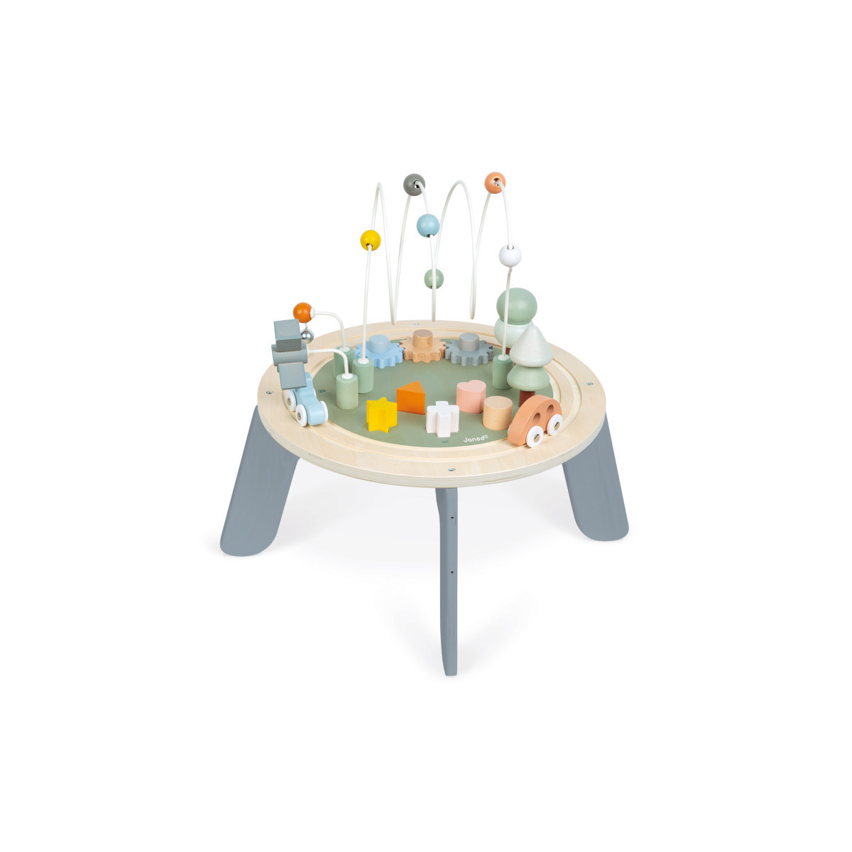 Here is the ideal toy to satisfy a toddlers' desires for discovery and manipulation! With this pretty wooden multi-activity table, baby will be delighted! Its size and the games offered make it perfectly suited to toddlers! This multi-activity table is a concentration of favorite activities: a circular train track with 2 vehicles that ring the bell, a small mill, 2 trees to stack, 3 loops with beads, 3 gears to rotate and 5 shapes to fit in.