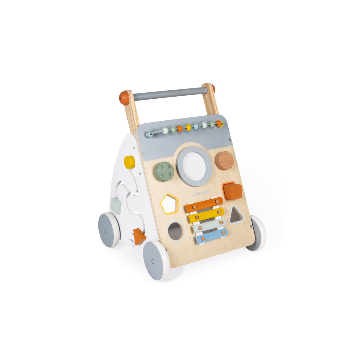 This beautiful multi-activity push-along trolley is great for helping children learn to walk. It’s suitable for children aged 12 months and over, and comes with an invisible, removable brake that allows you to stop and release the wheels as desired, so you can control the speed of the walker as your child grows. The trolley also gives your child 9 different ways to test their motor skills and dexterity: an abacus, a shape box, a maze, gears, a rotary switch with built-in sound, a “scratchy” button, a magnifying rotary mirror, a drum, and metal xylophone to develop their musical ear. And with its felt mat to reduce the noise of falling blocks and its silent wheels, our designers really have thought of everything! Given all that and its trendy design, you and baby are bound to love it! We love this early-years trolley’s natural wood and the white and grey color scheme, which is accentuated by the splashes of color that come with the nine different activities! The Sweet Cocoon collection features toys for infants with soft colors and rounded shapes, providing a wide range of fun activities that will keep babies and toddlers entertained for hours!