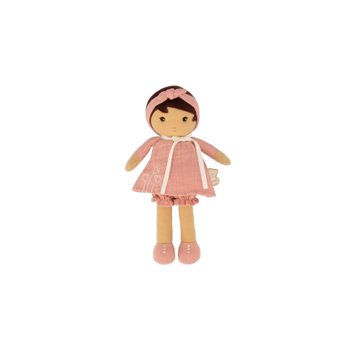 Here is Amandine, a pretty 9.75 inch doll in pastel tones. Amandine's soft shades are an ode to natural beauty and back to basics. Her dark skin is that of a child brought up in the open air. Its ample and sober dress is above all comfortable, referring to the 'slow life', while remaining very soft to caress by little hands. Amandine is a birth gift, elegant in its sobriety and its new material. Its small size allows it to be taken wherever your baby will go. Machine washable. Suitable for babies from birth.