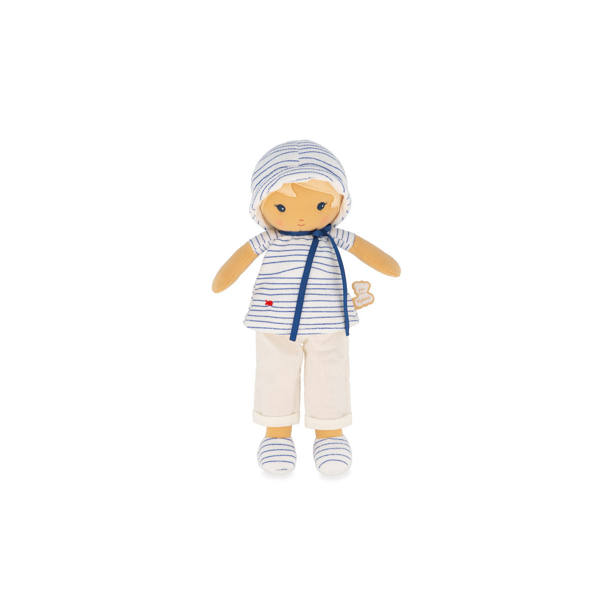 Eli is a fabric doll dressed as a little sailor, who invites you to go on an adventure near the water. The doll measures 12.48 inches and is suitable for babies from birth. Eli loves touching, climbing and jumping in the sea, as evidenced by her light, casual outfit. This doll wears a sailor top with contrasting stripes that will be easy for young children to spot. Its delicate fish embroidery is a reminder of the sea and the ocean, the element Eli prefers to play in. Eli's baggy trousers are easy for youngsters' clumsy hands to grasp. Thanks to its elegant hat, Eli is not afraid of sunburns. Around its neck is a pretty ribbon on which you can write baby's name. The size of this baby doll makes it ideal for cuddling, and little hands can easily grab the doll by the arms or legs. Eli doll is made from polyester and cotton. It is machine washable at 30 degrees C and comes in a beautiful gift box, for a tender baby gift.