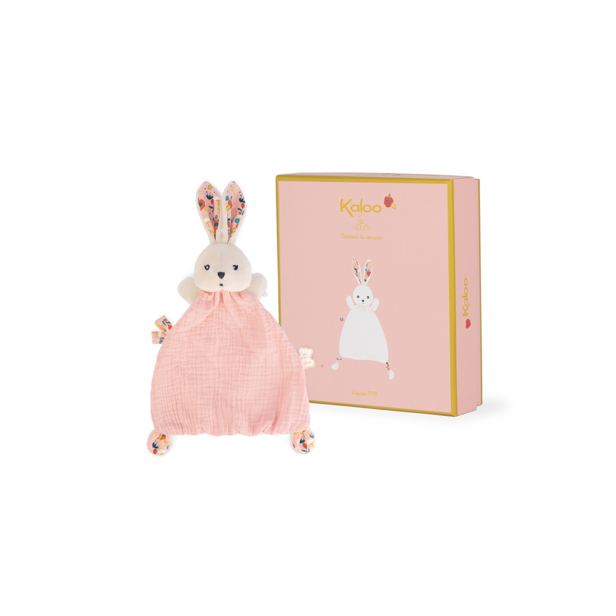 Introducing a sweet rabbit doudou with long ears and tiny feet easy to grab, that will delight the little ones. Its body is made of two fabrics for a soft and a fluffy side. Its ears and feet in peach fabric are printed with a fresh and dynamic poppy pattern. Stuffed with recycled polyester stuffing. Machine washable. Presented in a pretty giftbox you can customize with a message at the allocated space under the cover. Measures 8.58 inches.