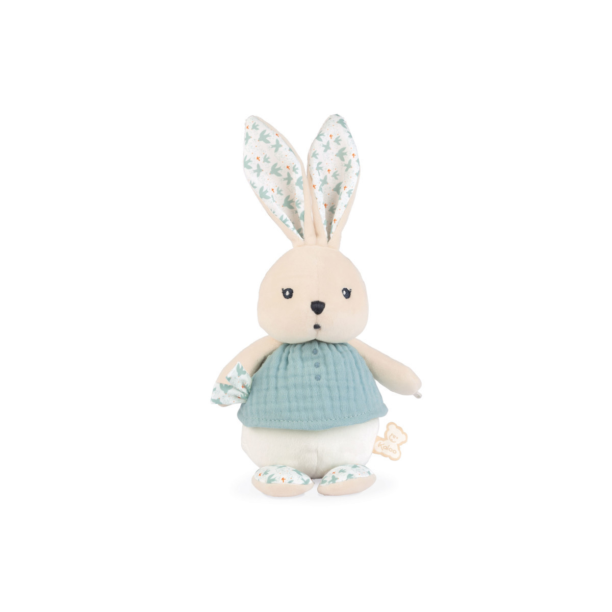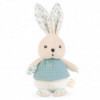 Here is a sweet rabbit doll with a plump head and body waiting to give the warmest cuddles. Babies will instantly love it in its muslin top, adorned with little embroidered buttons. Its ears and feet in peach fabric are printed with a poetic, classic and delicate pattern. Stuffed with recycled polyester stuffing. Machine washable. Presented in a pretty giftbox you can customize with a message at the allocated space under the cover. Measures 8.58 inches.