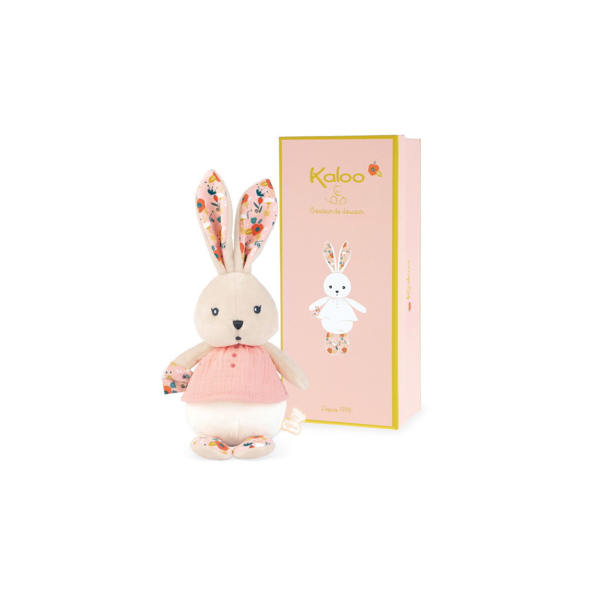 Here is a sweet rabbit doll with a plump head and body waiting to give the warmest cuddles. Babies will instantly love it in its muslin top, adorned with little embroidered buttons. Its ears and feet in peach fabric are printed with a fresh and dynamic poppy pattern. Stuffed with recycled polyester stuffing. Machine washable. Presented in a pretty giftbox you can customize with a message at the allocated space under the cover. Measures 8.58 inches.