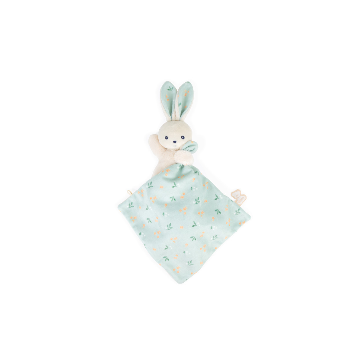 This rabbit enveloped in 7.09 inch square of softness will be baby's favorite companion. Particular care has been taken in selecting 95% recycled materials and stuffing. With its small fluffy micro-velvet body, the rabbit is easy to grasp and hold by its body or its long ears. The little rabbit holds between his paws a blanket painted with golden lemons and other rural details. This delicate and poetic print is found in the rabbit’s ears and enhances the whole. Presented in a beautiful gift box that can be reused as a storage case. It's the perfect comforter for a gift made from recycled materials. Machine washable at 30°. From birth.