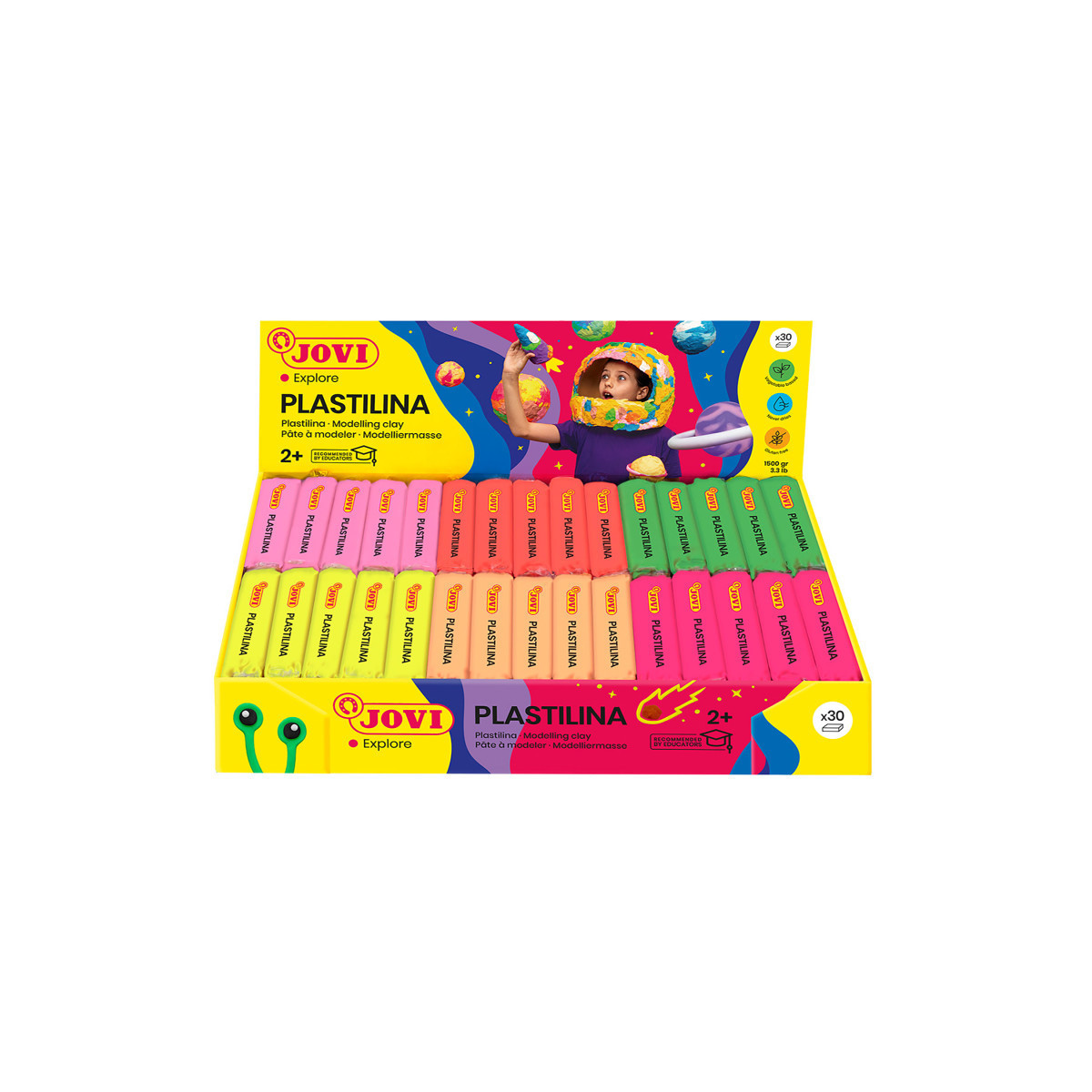 With JOVI plastilina, the possibilities are endless. Mold and shape with ease, or unleash your creativity by experimenting with molds and other techniques. JOVI plastilina delivers unmatched versatility and fun. Parents can rest assured knowing that JOVI plastilina is gluten-free and safe for even the youngest artists. Let your child's imagination soar as they dive into the colorful world of JOVI plastilina – where creativity knows no bounds! Sold as a display box of 30 individually wrapped, 50 gram bars of plastilina modeling clay in neon green, neon yellow, neon pink, orange, and pink (5 bars each of 6 colors).