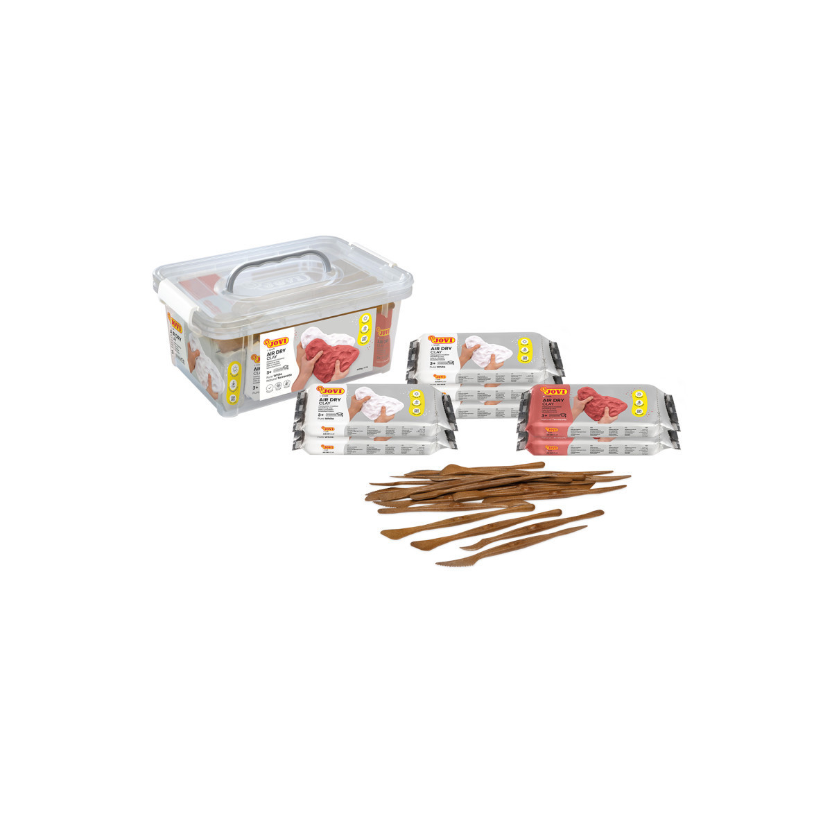 Forget the hassle of baking or firing – JOVI Air Dry Clay air dries naturally in just 24 hours, depending on the thickness of your craft. The result? A fine and smooth finish that serves as the perfect canvas for your creativity. Decorate your creations with any water-based paint, acrylic paint, special markers, or varnish to add your personal touch and bring your vision to life. With JOVI Air Dry Clay, crafting has never been easier or more enjoyable. Say goodbye to high-temperature ovens and hello to effortless creativity. Let your imagination soar and watch your creations come to life with JOVI Air Dry Clay. Set includes seven 1.1lb bars of air dry clay (5 white and 2 terra cotta) and 20 spatulas.