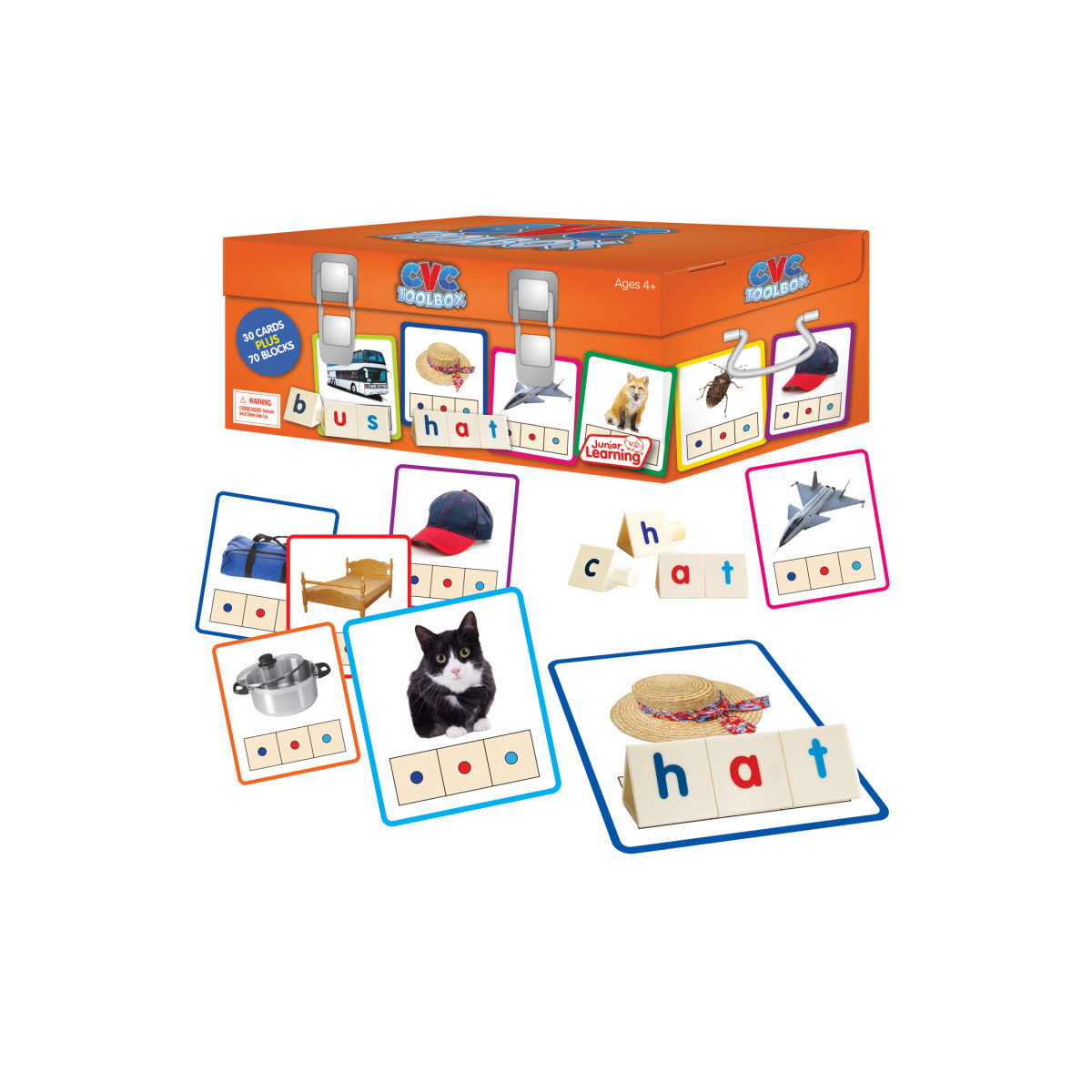 The CVC Toolbox is a handy tool for building CVC words. Includes 70 tri-blocks covering beginning, middle and final sounds as well as 30 word building cards with real photography.