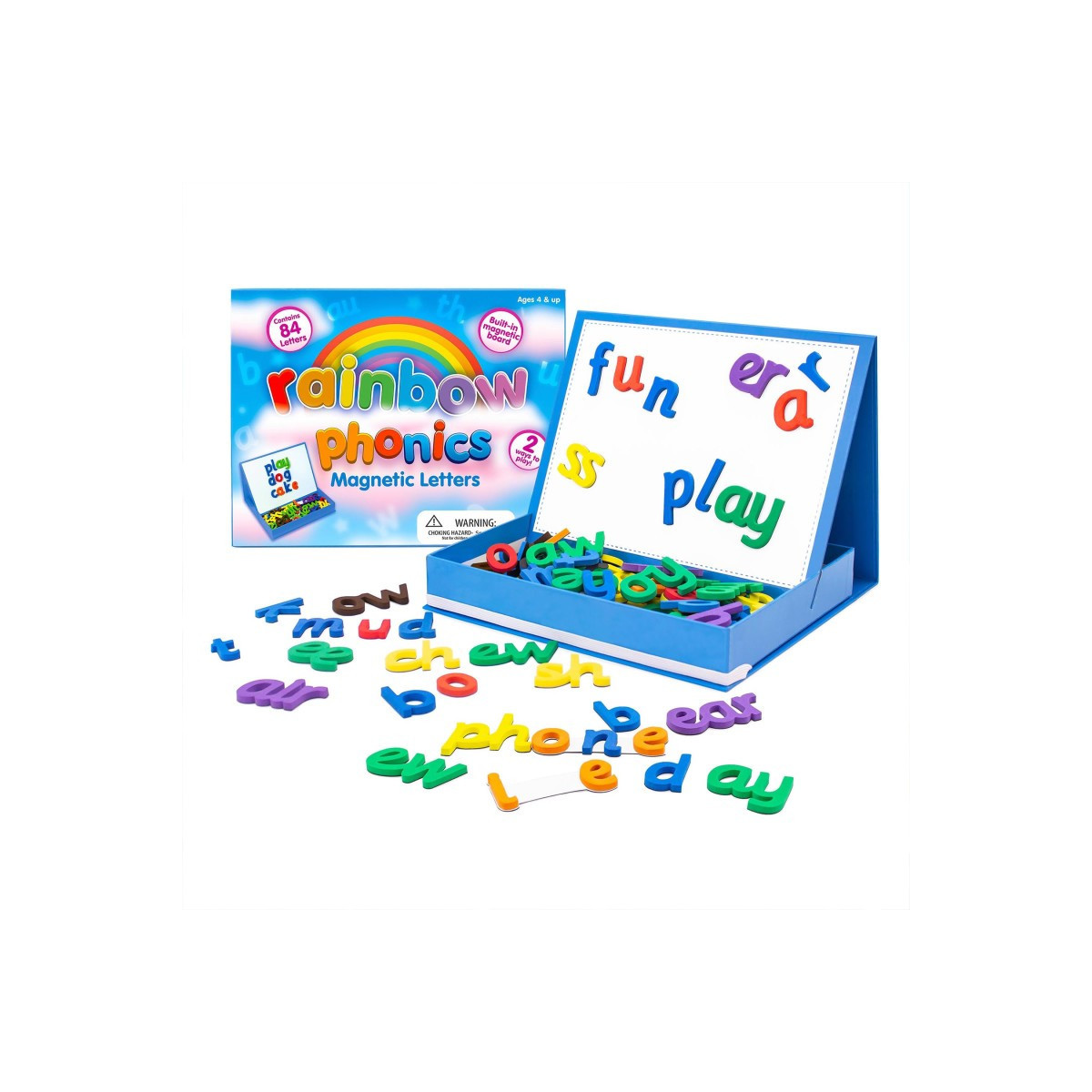 - Complete phonics magnetic letter set in self-contained box with a pop-up magnet board