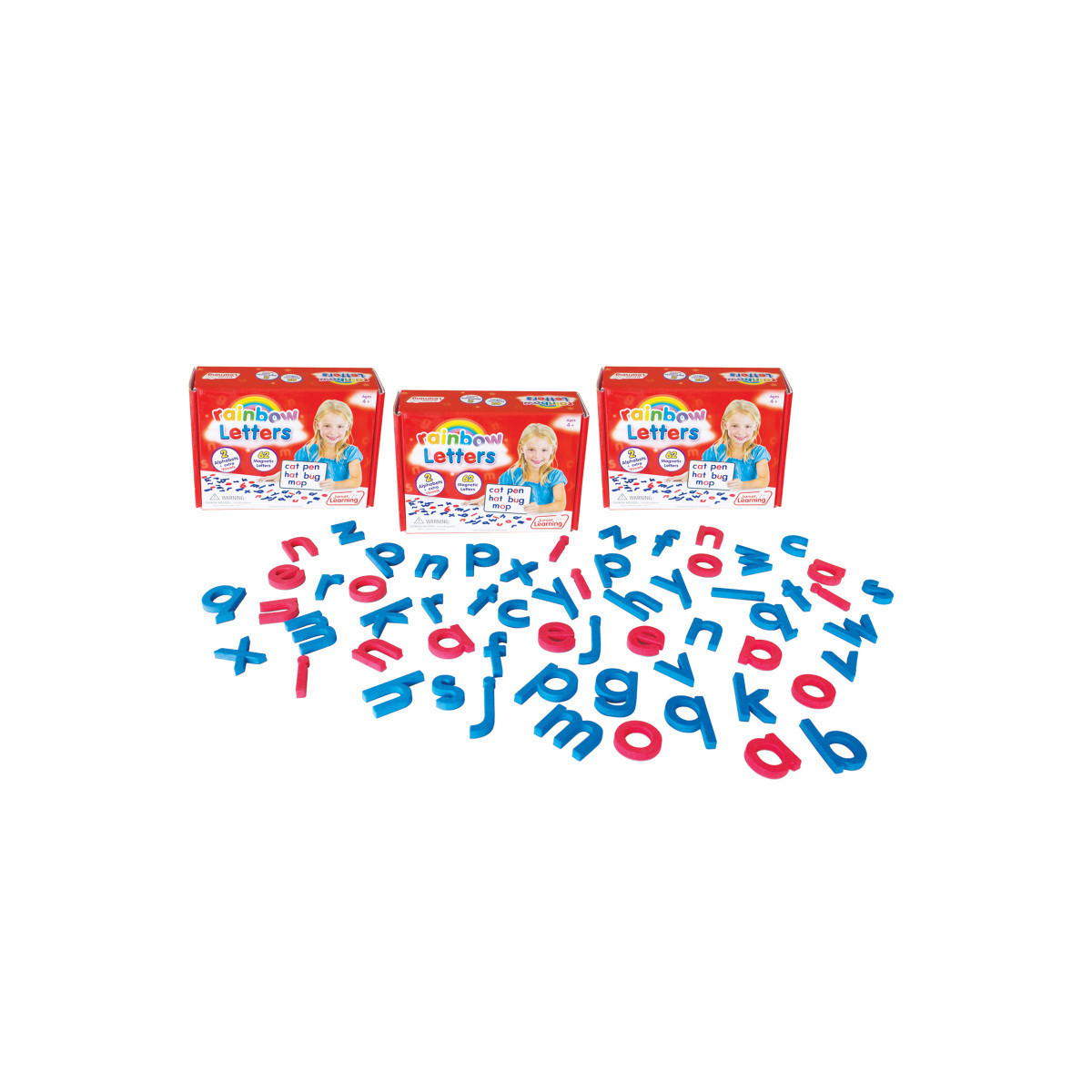 Rainbow Letters are a set of magnetic letters in a box. Includes 2 sets of the alphabet and an extra 2 sets of vowels. Vowels are color-coded in red and consonants are color-coded in blue. Perfect for building CVC words or completing alphabet arc activities. Each pack includes 62 letters. Sold as 3 packs for 186 letters total.