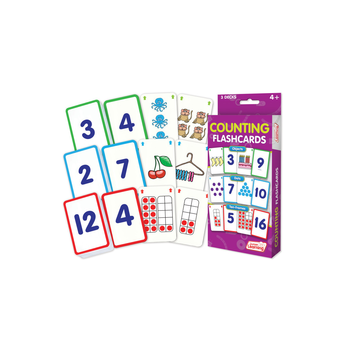 This value pack of flashcards includes 3 decks of 54 cards for teaching counting. Covers animals, objects and ten-frames. Visual arrays are provided to help children see mathematical relationships. Teaches fast, automatic recall. A perfect activity for independent or guided learning. Contains: 3 flashcard decks, 162 cards in total. Cards also work with the Flashbot, sold separately. For ages 4+.