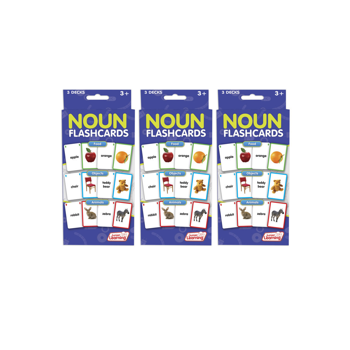 Each set of 3 decks of flashcards (N=162 cards) includes food, objects and animals. Photographic images used throughout. Sold as 3 sets for a total of 9 decks of cards (486 cards total).
