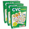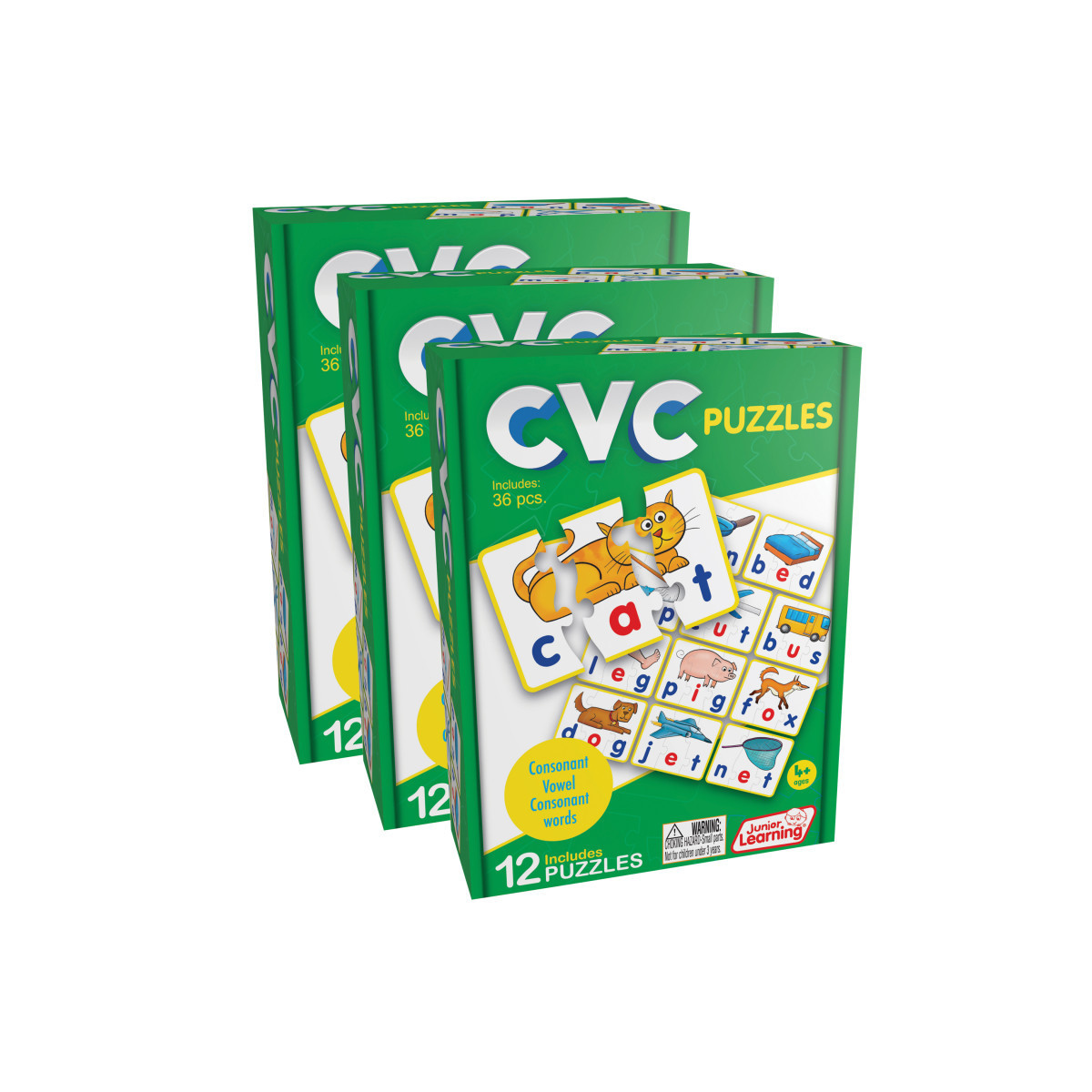 This CVC self-correcting puzzle set is ideal for teaching children consonant vowel consonant patterns and building words. Children can piece together consonant, vowel and consonant pieces to create a completed word with a matching picture. Ages 4+ Each set includes 12 puzzles (36 pieces). Sold as 3 sets for a total of 36 puzzles.