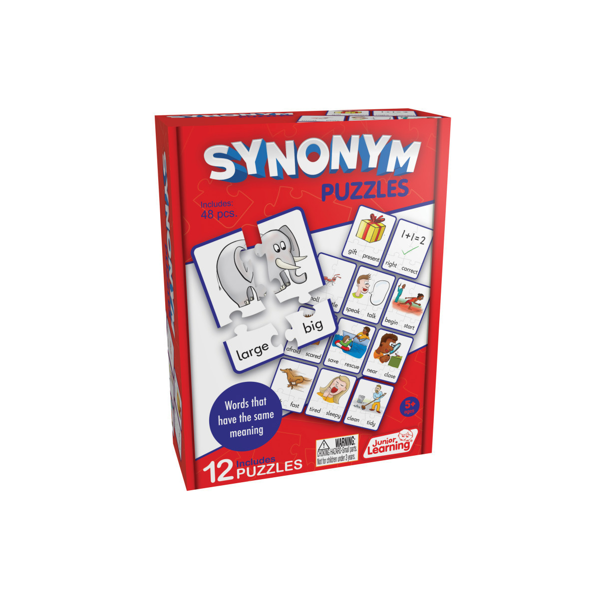 Synonyms are words that are different but have the same meaning (such as large and big). Piece together the words that have a similar meaning with their matching pictures, in this self-correcting puzzle, in order to create a completed card. Contains 48 pieces. Ages 5+