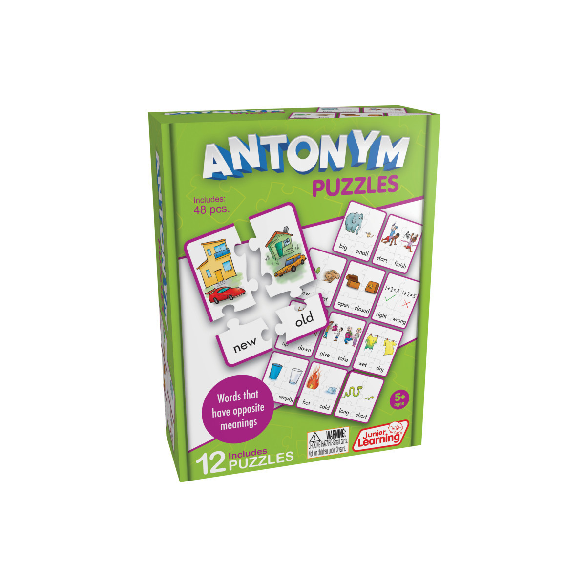 Antonyms are words that have opposite meanings (such as hot and cold). Piece together opposite words with their matching pictures, in this self-correcting puzzle, to create a completed card. Contains 48 pieces. Ages 5+
