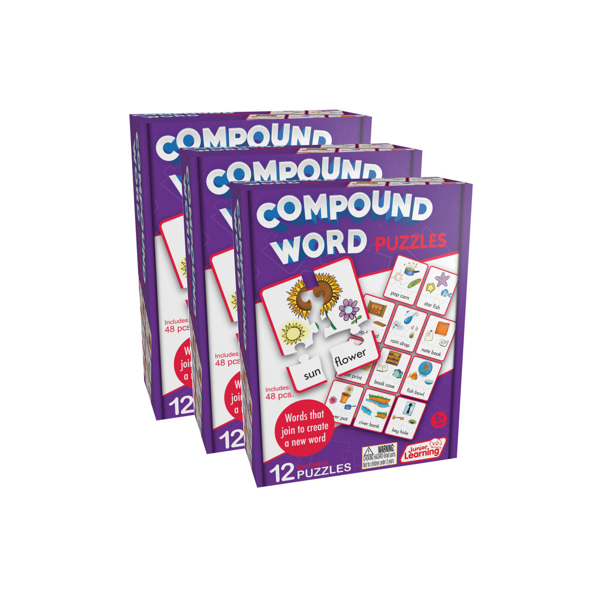 Compound words are 2 separate words that can be joined together to create a new word with a new meaning (such as sun and flower creating sunflower). Piece together the words that can be conjoined with their matching pictures in this self-correcting puzzle, to create a completed card. Ages 5+. Each set includes 12 puzzles (48 pieces). Sold as 3 sets for a total of 36 puzzles.