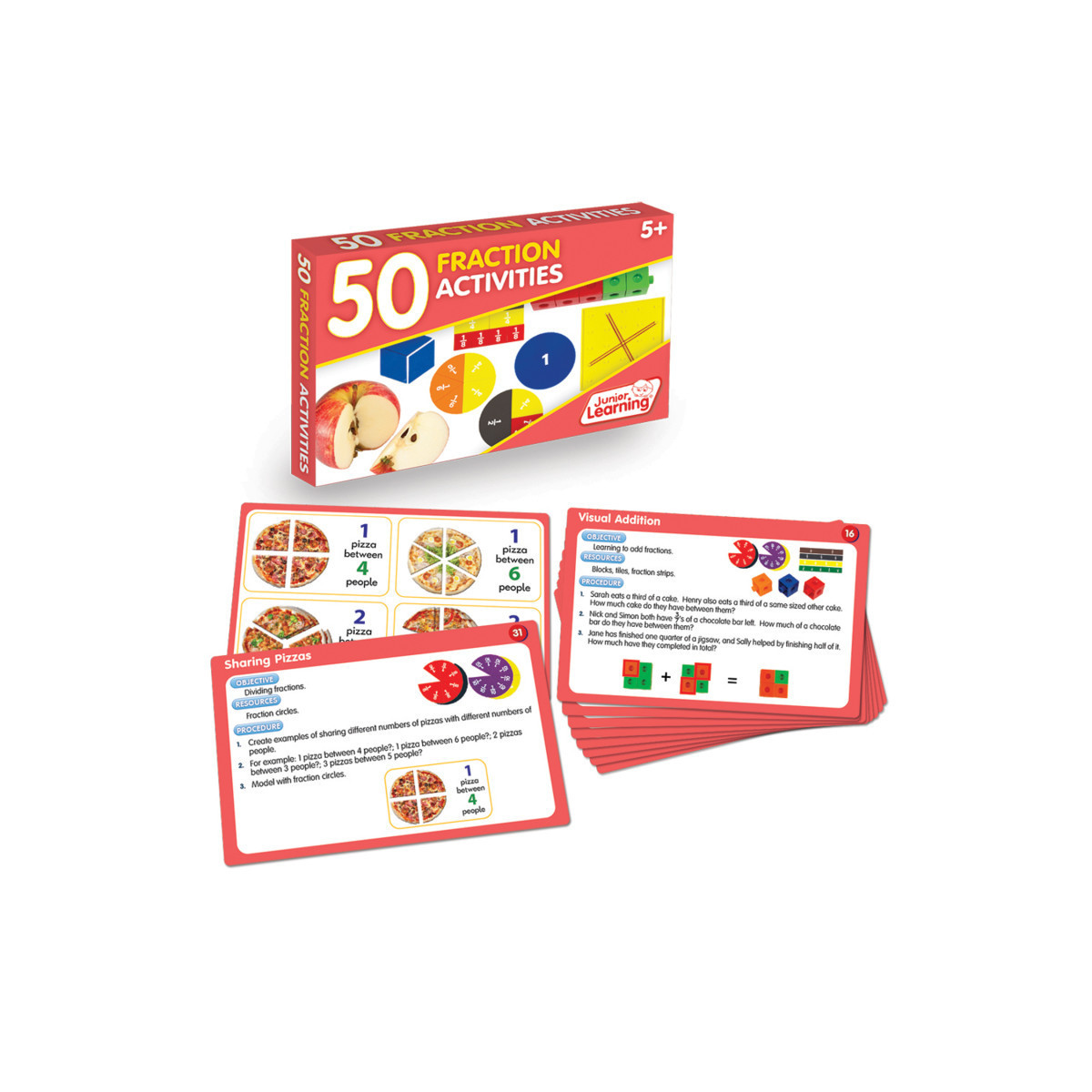 50 Fraction Activities is a set of 50 double-sided activity cards for teaching fraction knowledge and understanding. Topics include: equivalent fractions, comparing fractions, fractions of a set, simple division, adding fractions, subtracting fractions, simplifying fractions, improper fractions, multiplying fractions, dividing fractions, common denominator, mixed numerals and decimal fractions. The front side provides teaching objectives, resources used and procedure. The other side provides visual examples. Math manipulatives used effectively throughout and presented in clear photography. Contains 50 double-sided activity cards and a contents card that can act as a check off list.