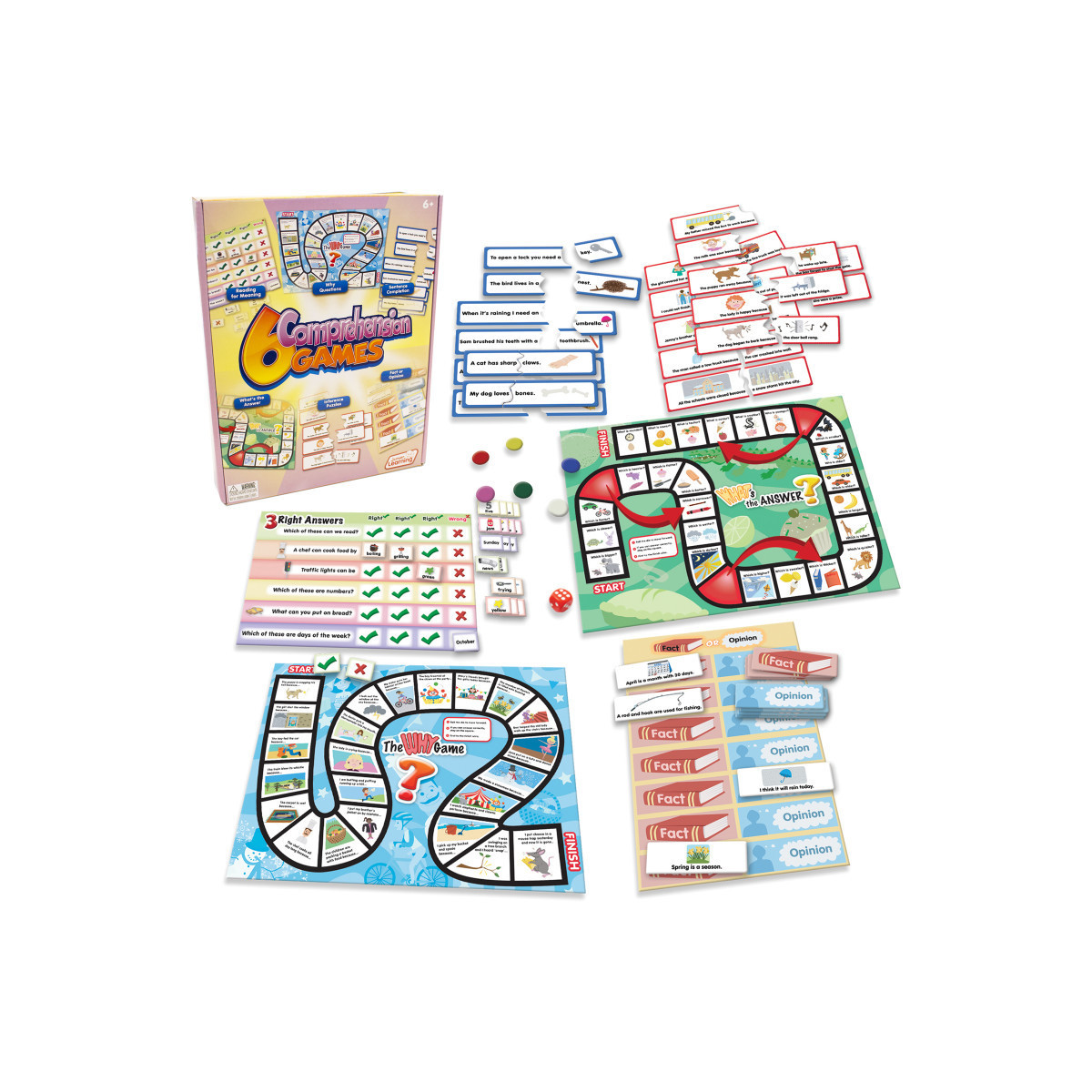 The design of this 6 Comprehension Games set covers simple understanding of words and meaning. Children will love using their comprehension skills to complete each activity and win the game. Value pack contains 2 board games, 2 matching games, 20 sentence puzzles and die & counters. Teaching topics include comprehension with questions & sentences. Includes game guide with instruction for all games. Ages 6+.