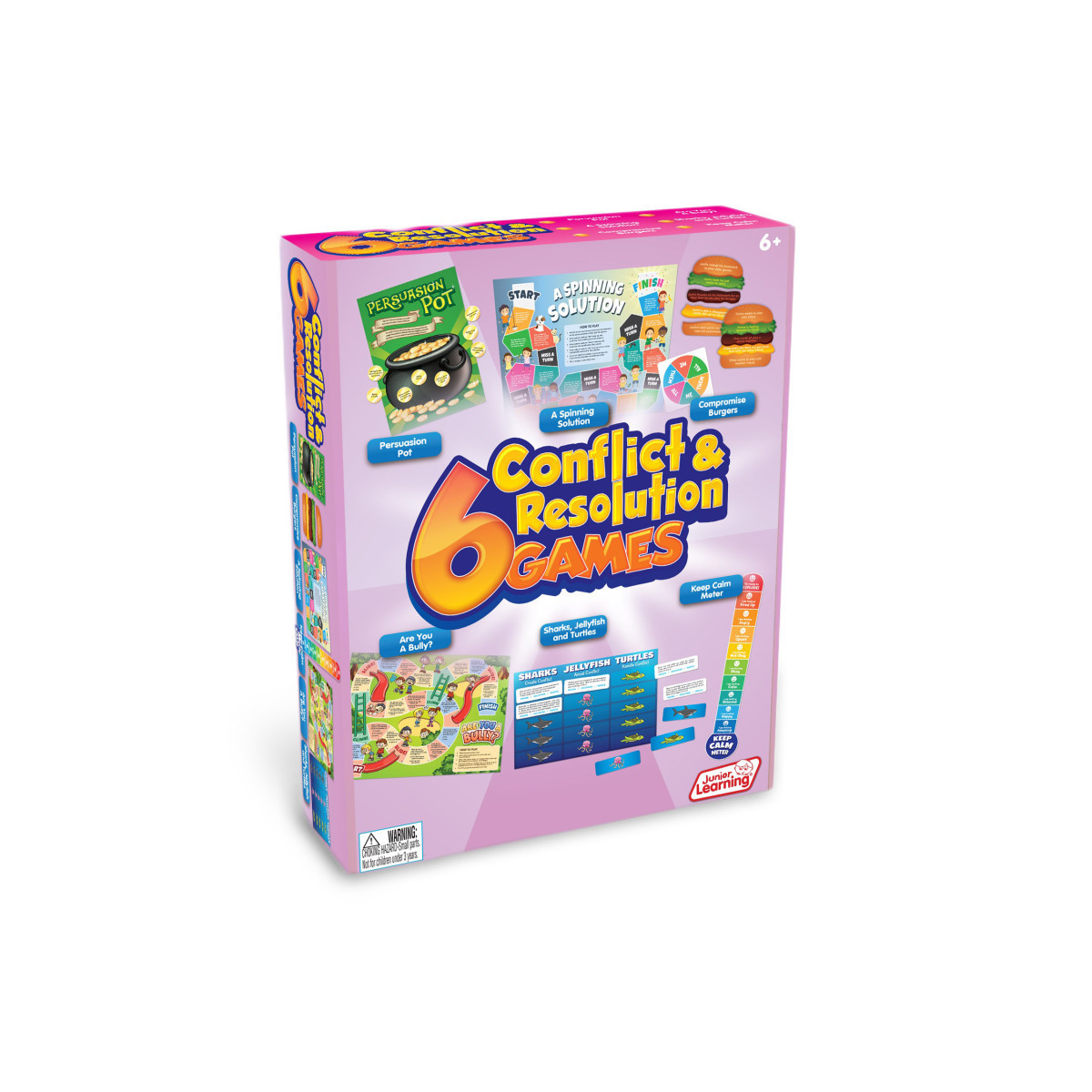 Children often encounter differences with others, but how easy are these differences to resolve? 6 Conflict and Resolution games is a unique set of games that focuses on how to recognize conflict, how to handle it and how to resolve differences in a more positive solution focused way. Each game and activity is vibrant and uses a number of different game plays to teach children about common conflict situation, how to recognize different emotional triggers, and how to understand and apply different conflict resolution techniques. Contains 2 board games, 1 matching game, 1 counter game, 1 thermometer, 20 puzzle pieces, counters spinner, and die. Ages 6+.