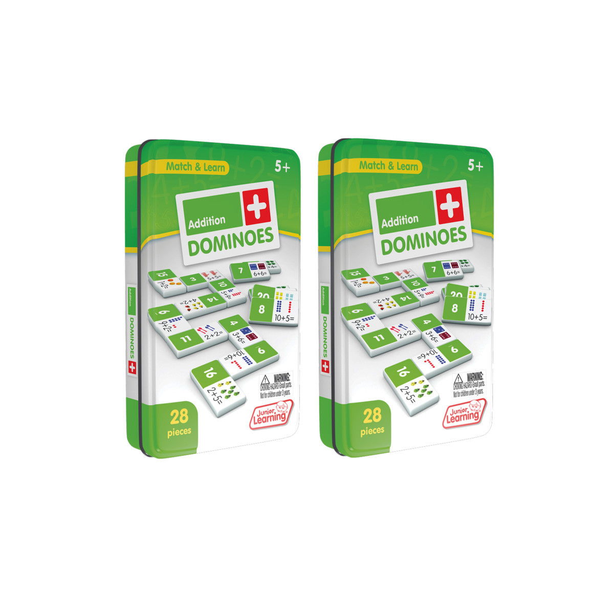 Addition dominoes include a 28 piece set on thick plastic dominoes. Dominoes come in a collectors tin for storage. Children will love the feel of real dominoes as they complete the addition matching game. Sold as 2 sets.