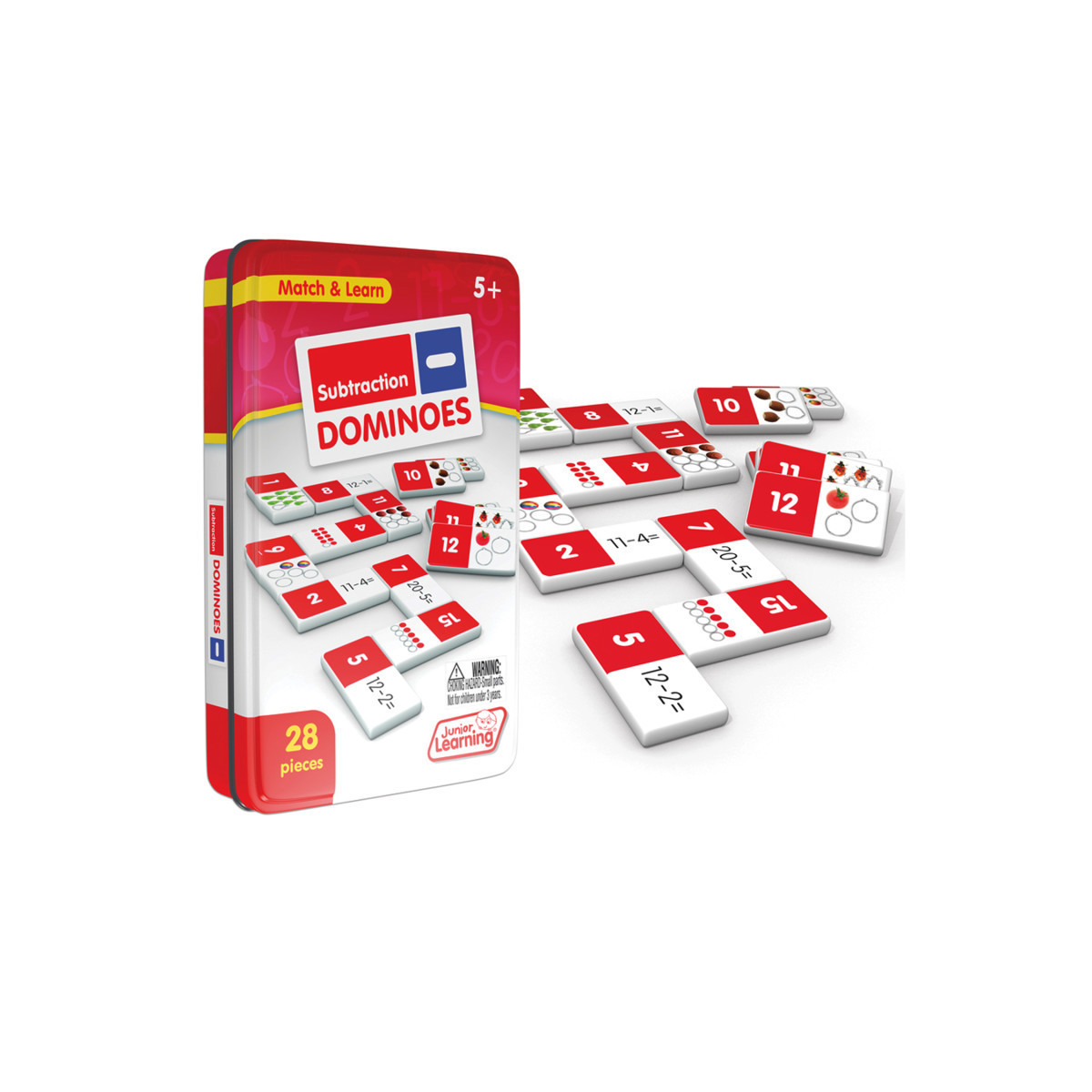 Subtraction dominoes include a 28 piece set on thick plastic dominoes. Dominoes come in a collectors tin for storage. Children will love the feel of real dominoes as they complete the subtraction matching game.