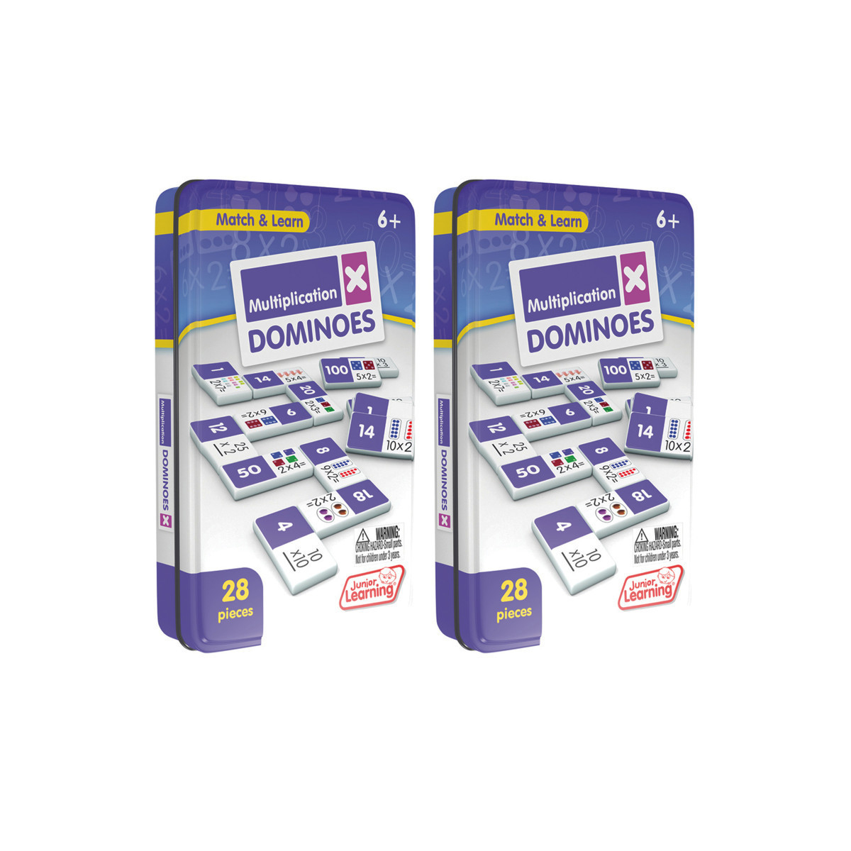 Multiplication dominoes include a 28 piece set on thick plastic dominoes. Dominoes come in a collectors tin for storage. Children will love the feel of real dominoes as they complete the numeracy matching game. Sold as 2 sets.