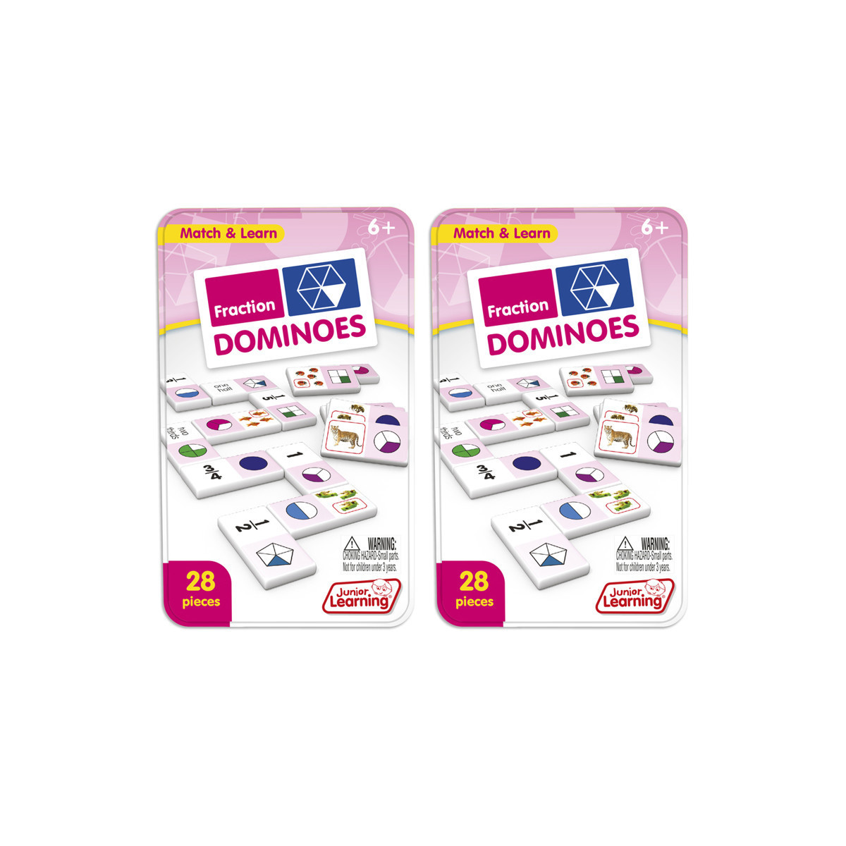 Fraction dominoes include a 28 piece set on thick plastic dominoes. Dominoes come in a collectors tin for storage. Children will love the feel of real dominoes as they complete the fraction matching game. Sold as 2 sets.