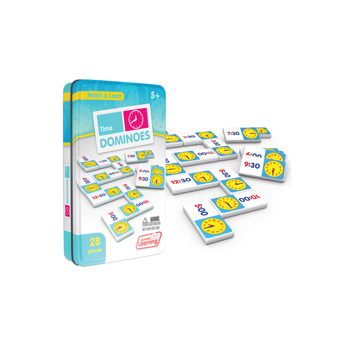 Time dominoes include a 28 piece set on thick plastic dominoes. Dominoes come in a collectors tin for storage. Children will love the feel of real dominoes as they complete the time matching game.
