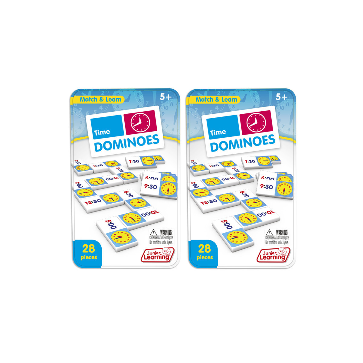 Time dominoes include a 28 piece set on thick plastic dominoes. Dominoes come in a collectors tin for storage. Children will love the feel of real dominoes as they complete the time matching game. Sold as 2 complete sets of dominoes.