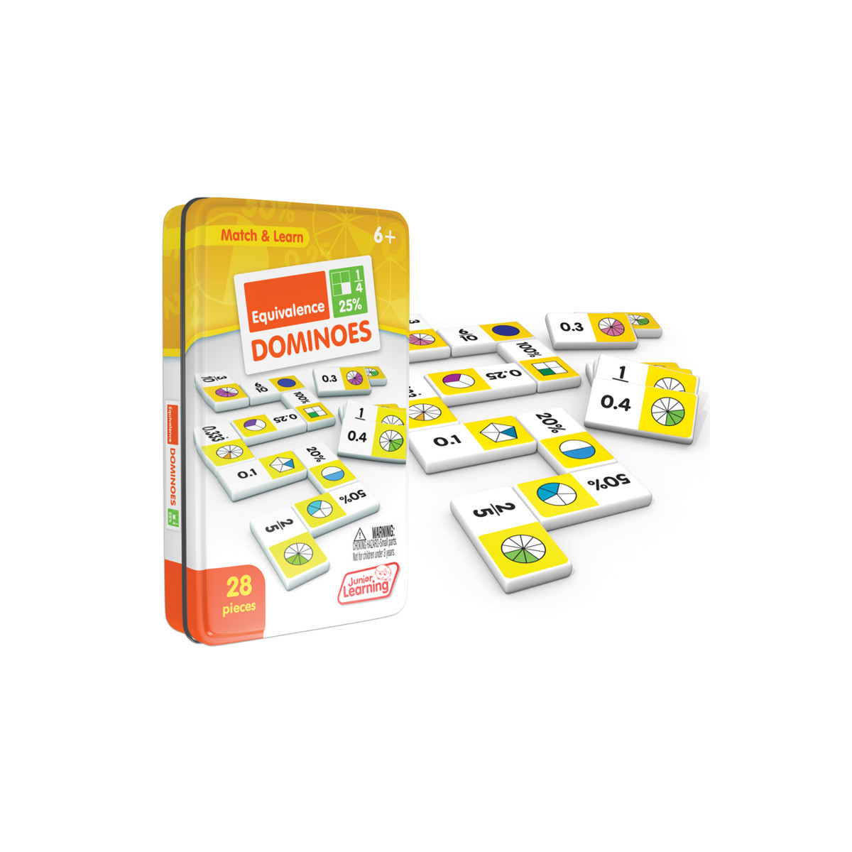 Equivalence dominoes include a 28 piece set on thick plastic dominoes. Dominoes come in a collectors tin for storage. Children will love the feel of real dominoes as they complete the equivalence matching game.