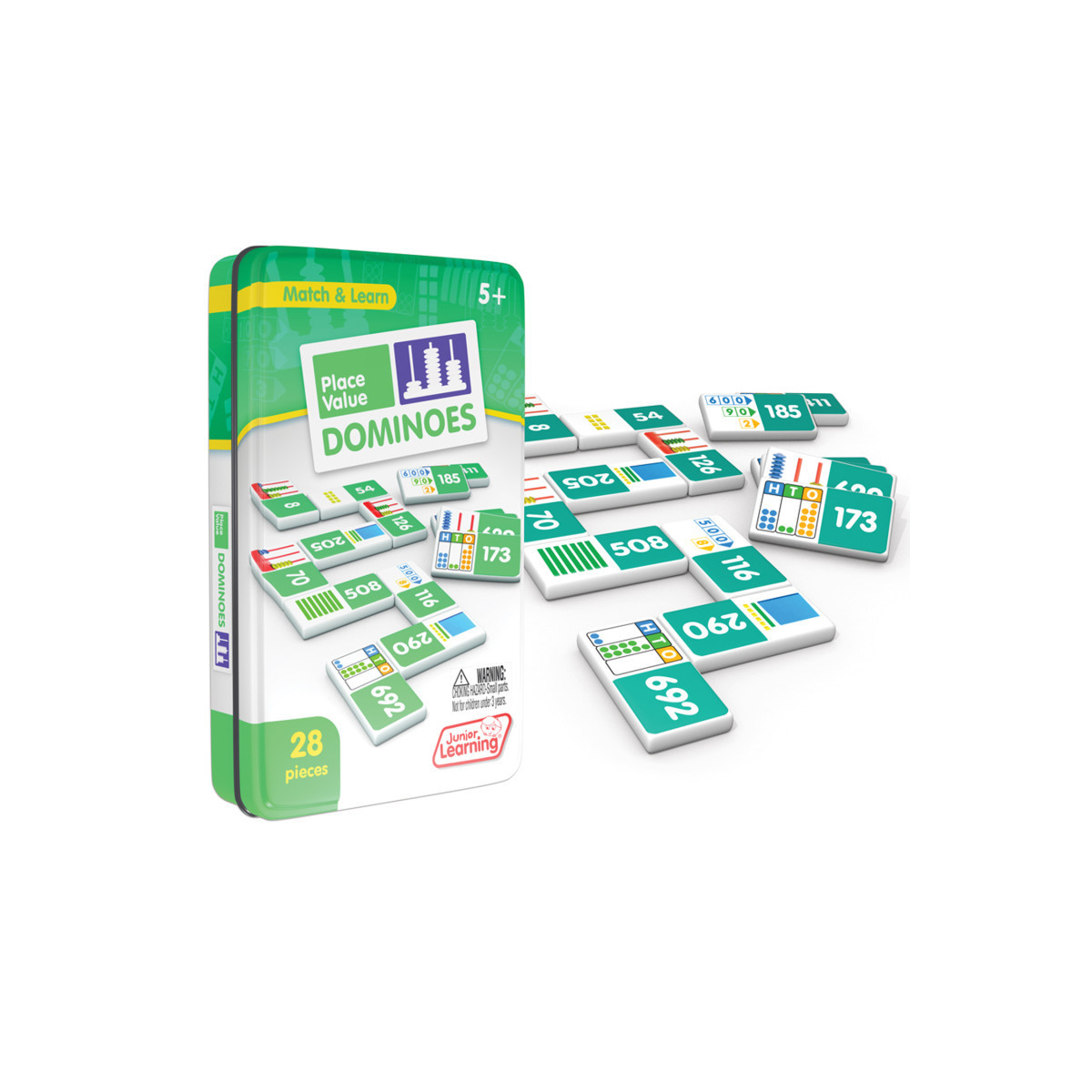 Place Value dominoes include a 28 piece set on thick plastic dominoes. Dominoes come in a collectors tin for storage. Children will love the feel of real dominoes as they complete the place value matching game.