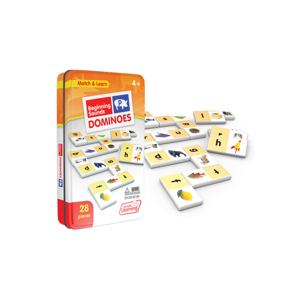 Beginning sound dominoes include a 28 piece set on thick plastic dominoes. Dominoes come in a collectors tin for storage. Children will love the feel of real dominoes as they complete the beginning sound matching game.