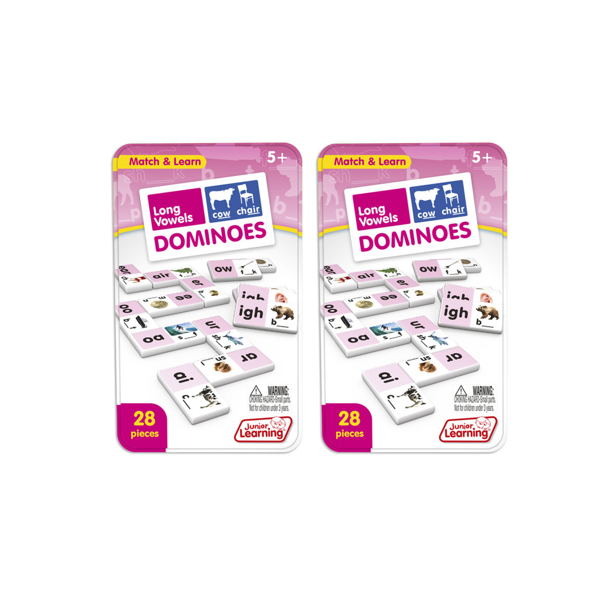 Long vowel dominoes include a 28 piece set on thick plastic dominoes. Dominoes come in a collectors tin for storage. Children will love the feel of real dominoes as they complete the long vowel matching game. Sold as 2 complete sets of dominoes.