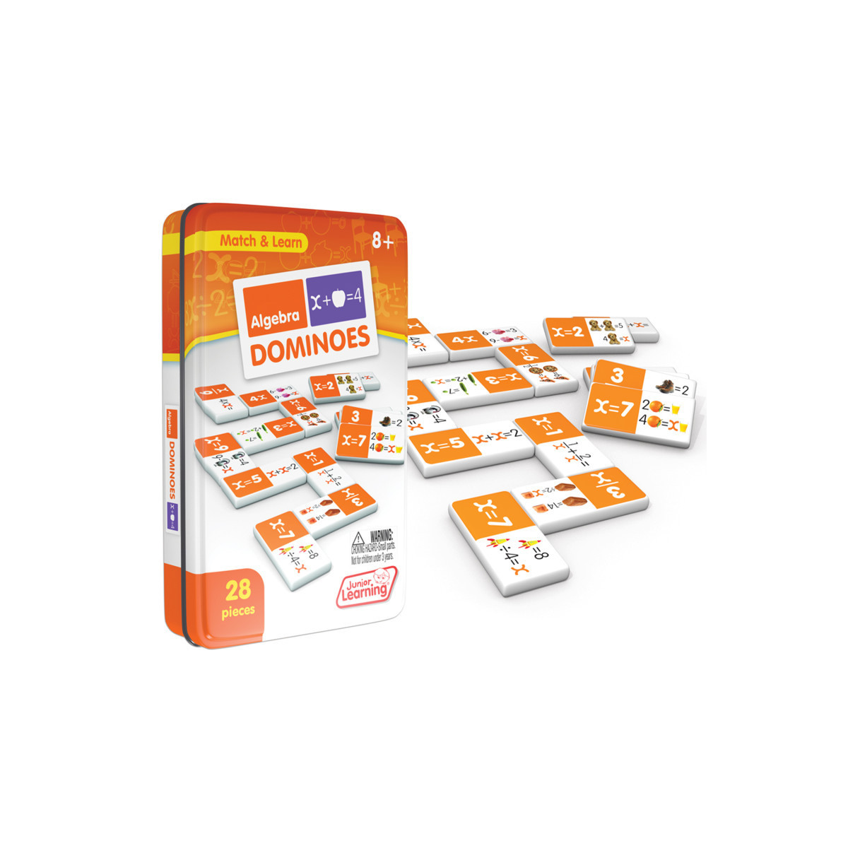 Algebra dominoes include a 28 piece set on thick plastic dominoes. Dominoes come in a collectors tin for storage. Children will love the feel of real dominoes as they complete the algebra matching game.