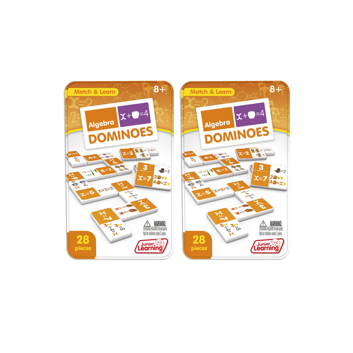 Algebra dominoes include a 28 piece set on thick plastic dominoes. Dominoes come in a collectors tin for storage. Children will love the feel of real dominoes as they complete the algebra matching game. Sold as 2 complete sets of dominoes.