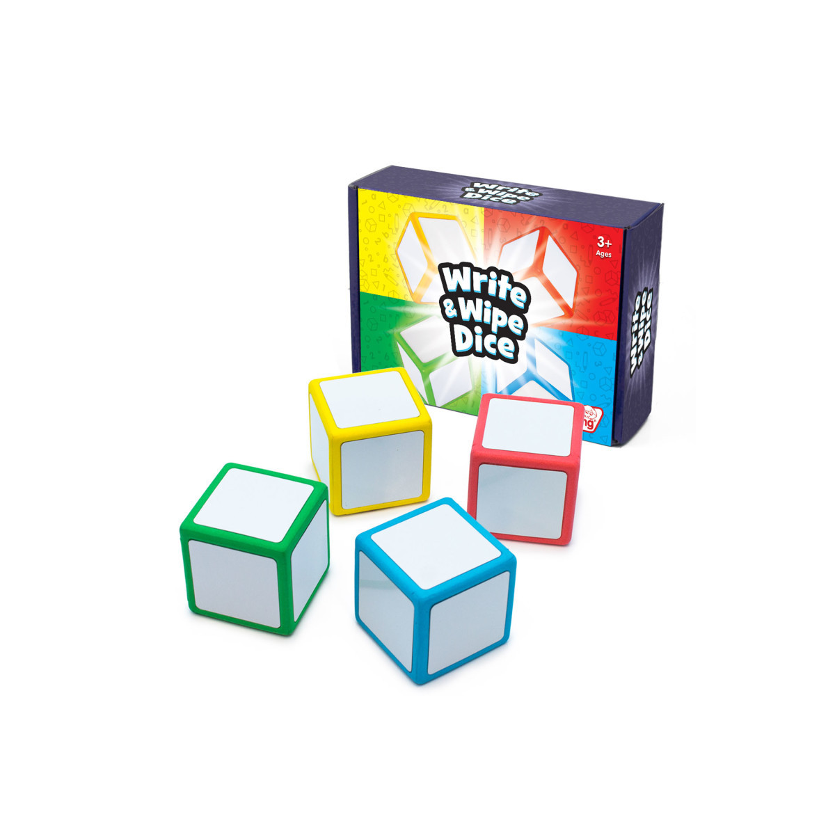 This set of four write on / wipe off magnetic dice comes in four bright colors. Each die can be used for teaching a range of curriculum topics, such as number, fractions, probability, letter sounds and sight words. Write numbers, letters, operations and more. Magnets can also be attached to faces. Contains 4 colored write and wipe dice. Comes in a handy storage box.
