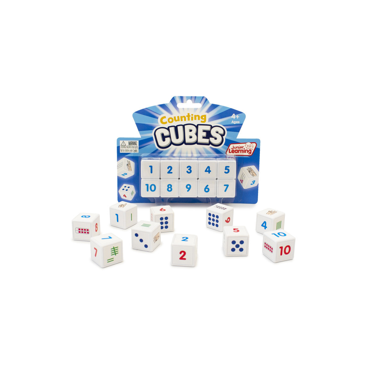 Counting cubes contain 10 number cubes for counting and ordering. There are six different faces including blue numbers, red numbers, fingers, ten frames, dots and lines. Create different number patterns and practice saying the missing number. Contains 10 six faced cubes. Ages 4+.