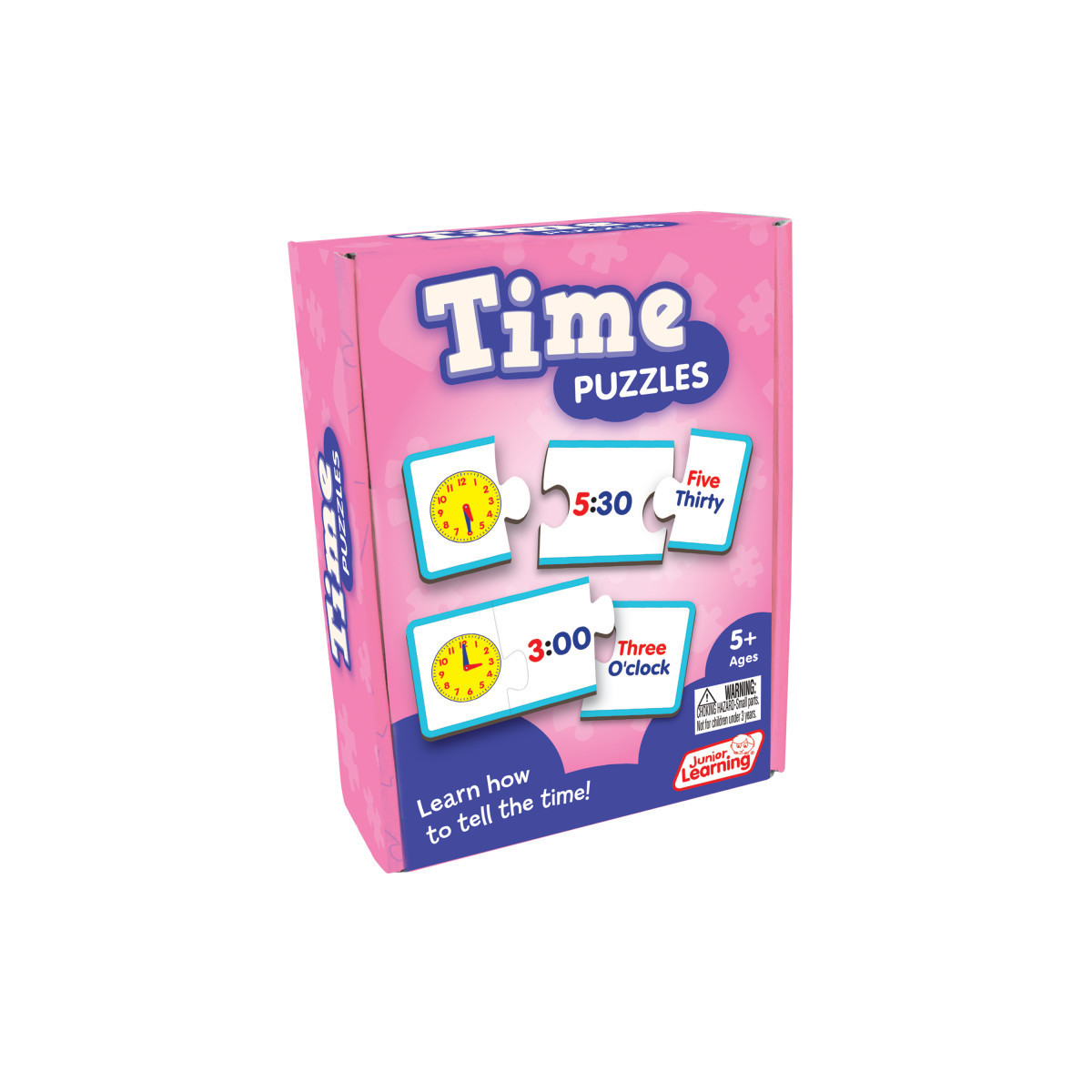 This 72 piece puzzle set includes 24 puzzles for teaching telling the time across analogue, digital and word forms. Color-coding across hours and minutes supports learning. Unique puzzle joins ensures only the correct pieces fit together and provide self-correcting support for solving each puzzle. For ages 5+.