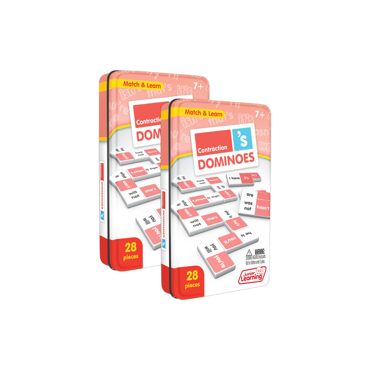 Contraction dominoes include a 28 piece set on thick plastic dominoes. Dominoes come in a collectors tin for storage. Children will love the feel of real dominoes as they complete the contractions matching game. Sold as a pack of 2 identical games.