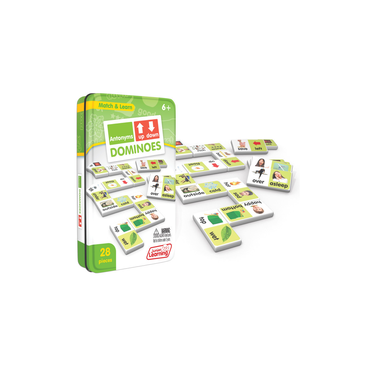Antonym dominoes include a 28 piece set on thick plastic dominoes. Dominoes come in a collectors tin for storage. Children will love the feel of real dominoes as they complete the antonym matching game.