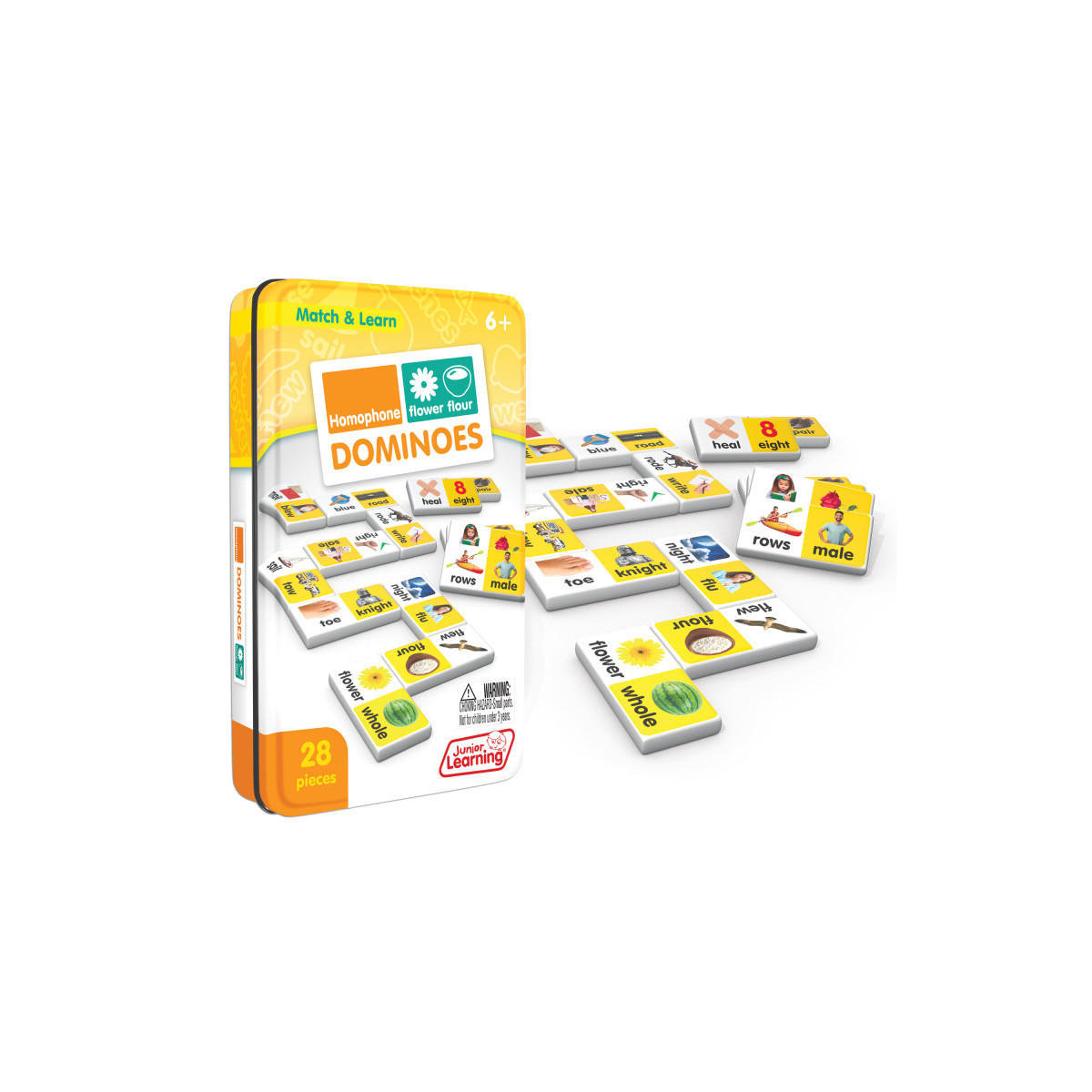 Homophone dominoes include a 28 piece set on thick plastic dominoes. Dominoes come in a collectors tin for storage. Children will love the feel of real dominoes as they complete the homophone matching game.